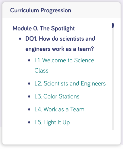 When you pin a lesson to your My Lessons on your Teacher Dashboard, your Curriculum Progression Tracker will show where your lesson fits within the Grade, Module and Driving Question structure.